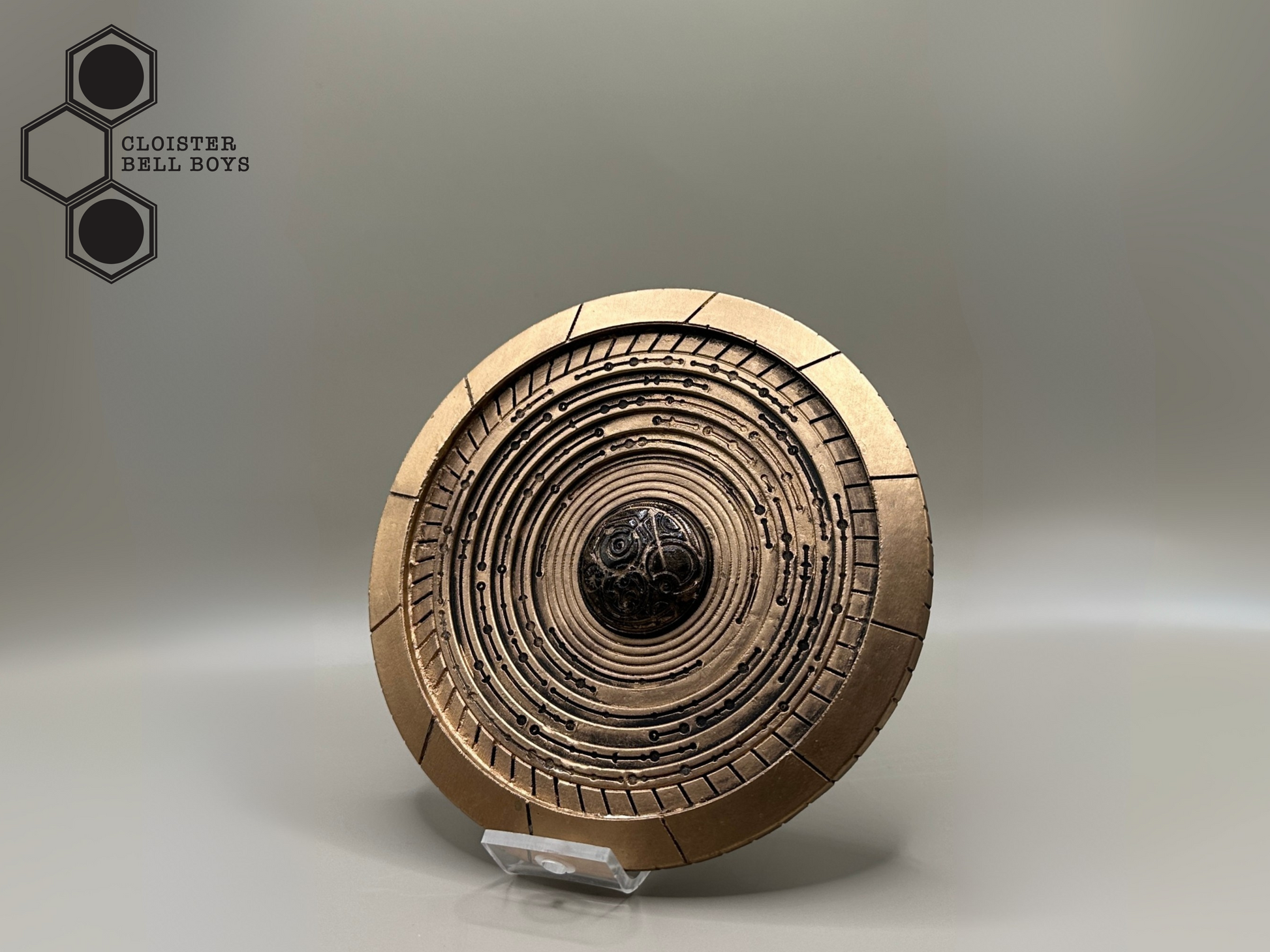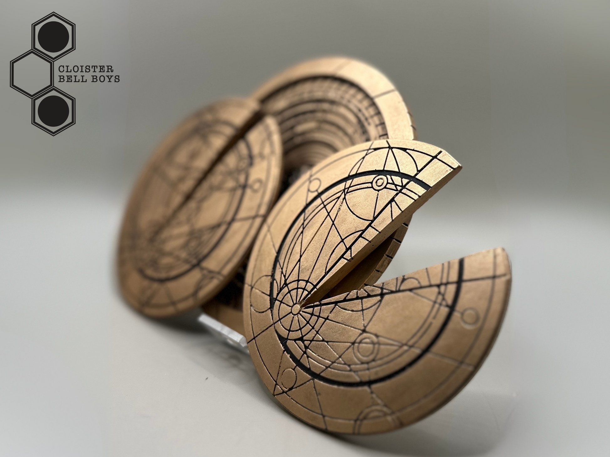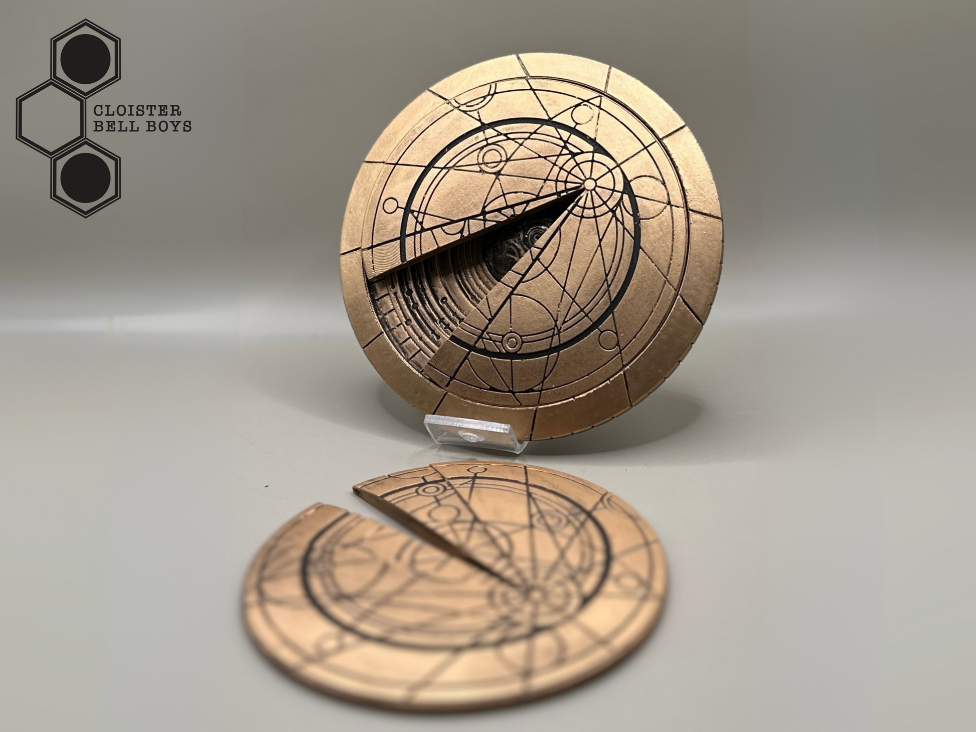 This hand-cast replica set includes both open configurations of the Series 9 prop. Each piece is cast in durable resin and sanded, primed, and finished with an antique gold rub by hand. This set is perfect for display or cosplay use.